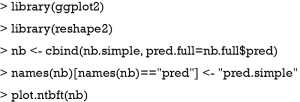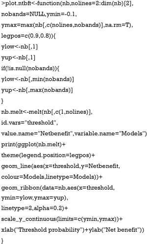 The results can be visualized by using ggplot2 system (6). A dedicated routine to plot the net benefit of different models is provided below, where it is convenient to reshape the data frame, aggregating all net benefit values in one column (7). Such a long format dataset can be easily mapped to the coordinate system with groups.
