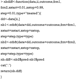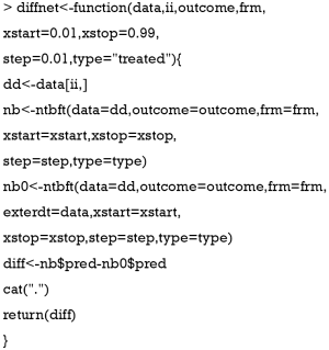 Before conducting bootstrap replicates, we first need to define a function to calculate the difference of net benefit (or over-optimism) of the net benefit obtained when evaluated on the same or a different data set as that used to train the model.