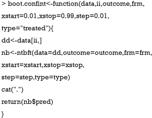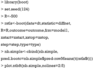 The boot() function is employed to perform the bootstrap procedure. In the example, the statistic argument specifies a function that returns a vector containing the statistic(s) of interest; a total of R=500 bootstrap replicates have been performed (but the user could easily change this parameter). Then, the corrected net benefit is computed by subtracting the mean difference from the net benefit estimated with the simple model. The obtained result is plotted in Figure 2. It shows that the corrected net benefit is very close to the uncorrected one, suggesting the overfitting is not a serious problem in our example. This is not surprising because the covariates are independent to each other and there is no noise factor (no overfitting). If correlated or noise covariates are included in the model, it may not be the case.