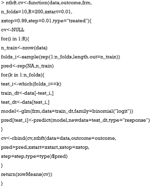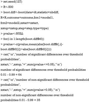 DCA was developed to overcome this problem. A key concept of DCA is the threshold probability, which was defined in the seminal paper by Vickers AJ that “threshold probability, pt, is where the expected benefit of treatment is equal to the expected benefit of avoiding treatment.” (2). In definition, it is obvious that the threshold probability can vary from patient to patient. For example, surgery-averse patients may opt to take surgery at a high risk of cancer, but cancer-averse patients are more likely to perform operation at lower risk of cancer. Thus, the DCA allows threshold probability to vary to examine whether one model is superior to another at a certain range of threshold probability (3), with respect to “the net benefit”. In this technical note, we provide code to implement DCA in an R environment, including plotting the net benefit, correction for overfitting, confidence intervals and a statistical test to compare two models over a range of threshold probabilities. Before providing our routines, we start by briefly recalling the concept of net benefit.