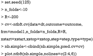 Seven out of the 9 arguments of the diffnet() are as in the ntbft() function. The argument n_folds specifies the number of k folds to split the original dataset (default is 10) and the argument R specifies the number of bootstrap replicates (default is 200), as described in the algorithm above. The function returns the cross-validates net benefit. One can then apply the following code to cross-validate our simple model and to plot the result obtained: