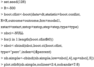 Calculation of 95% confidence interval for the net benefit of our simple model based on R=500 bootstrap replications, together with a plot of the results can then be obtained as follows: