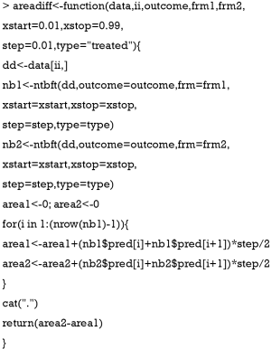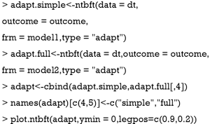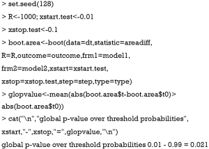 The areadiff() function has several arguments, most of them are similar to that described in previous sections. Here the xstart and xstop arguments define the range of interest. Then, we use the boot() function to replicate the difference in the A-NBCs. For example, we can compare our simple and full model using 1,000 bootstrap replications over the threshold range 0.01–0.1 as follows: