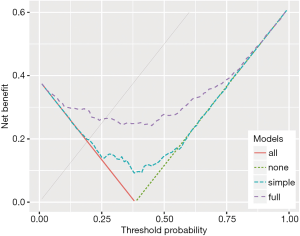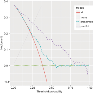The output of the above example is shown in Figure 1. The net benefit is plotted against the threshold probability. The “all” line shows the net benefit by treating all patients, and the “none” line is the net benefit for treating none patients. It appears that the full model is always superior to the simple model across a wide range of threshold probabilities, with the highest difference at a threshold probability around 0.5. At that threshold, the net benefit (for the treated) is 0.030 for the simple model, and 0.162 for the full model. At that threshold, according to the interpretation given above, this means that one can administrate about 16−3=13 more profitable treatments (out of 100 patients) when using the full model rather than the simple model to predict sepsis (net of false positive).