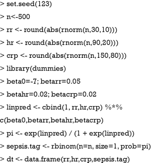 The above code generated a data frame containing 4 variables: respiratory rate (rr), heart rate (hr), C-reactive protein (crp) and observed disease status (sepsis.tag). The first three variables will be the predictors and the last one (sepsis) will be the response (outcome) to be predicted. For simplicity, note that no correlation has been generated among the three predictors. The probability pi to have sepsis has thus been generated as: