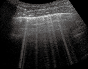 A characteristic ultrasound picture of the hyperdense, non-consolidated superficial lung is sonographic interstitial syndrome (SIS): the presence of multiple focal, patched or diffuse vertical artifacts (B-lines) fanning out from the lung-wall interface (13). White lung, characterized by a granular and mostly white texture which starts at the pleura line and ends at the bottom of the screen, is also an aspect of SIS for some authors (14).