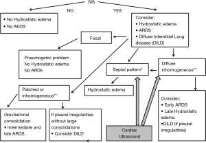 Focal findings, consolidations, spared areas, pleural irregularities and impaired pleural sliding are typical signs of primitive lung involvement. SIS with bright, long, separated, modulated B-lines arising from a normal pleural line is strongly predictive of early CPE. Figure 2 illustrates an algorithmic approach used in our clinical practice.