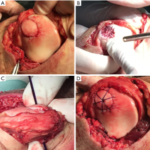 Before other procedures, a knee arthroscopy was carried out for the diagnosis of the intra-articular injury, the size and location of the OCF were confirmed. The surgeon attentively evaluated whether the fracture fragment was fresh or not. While the rim of fragment stayed sharp and the donor surface of the patella was fresh; then the suture fixation procedure was performed.