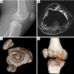 - Marberry KM, Ginsburg Z. Extra-articular synovial fluid extravasation following operative fixation of an osteochondral fracture of the patella. Orthopedics 2012;35:e1267-71. [Crossref] [PubMed]