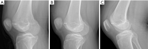 Various materials have been reported in the fixation of patellar or lateral condylar OCFs, including metal screws (21), bioabsorbable screws or pins (6,8,22), bone screws (23), and suture (10,24). Bioabsorbable screws or bone screws have the advantage of not requiring a second surgery for fixation removal, whereas bioabsorbable materials still have certain complications, such as allergic reactions (25), breakage (26), or loosening (27,28).