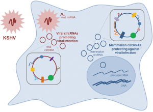 Finally, as suggested in the Tagawa report, some endogenous circRNAs may provide defense against viral infection. These circRNAs could be exploited therapeutically to prevent or reduce viral disease. For example, administration of hsa_circ_001400, possibly in combination with other cellular circRNAs induced by KSHV, might engender a more robust anti-viral response. Similarly, antagonization of KSHV-encoded circRNAs could have additional therapeutic benefit. Towards these goals, it is imperative that biological methods be developed to produce protective circRNAs and antagonizing RNAs at a large scale, as well as methods to direct them to target tissues for antiviral outcomes in the clinic.