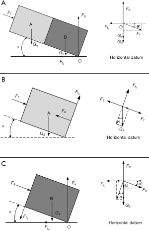 The FE simulation could reveal the biomechanical environment of pelvis ring better and predict the load transferring and the stress distribution between fixation and bone structures. Based on our results, the pelvis was more stable under vertical posture, meaning that siting on the bed may be better than reclining for fracture healing. This situation was different from the principles of clinical nursing. To verify the interesting result, a simple physical model was introduced in our research. As shown in Figure 8A, we employed two mass blocks to simulate the fractured pelvis, and the force in the process of lifting was analyzed. Firstly, the mass block A and B were regarded as a whole system S and the force analysis was carried out. When S was lifted off the horizontal datum level, the system was supported by the reaction force at FN the fulcrum O and the friction force