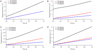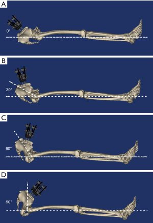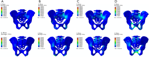 In the present study, the degree was regarded as 0° when the patient was in supine (Figure 2A). We included three kinds of angle (30°, 60°, and 90°) in the FE simulation to evaluate the stability of the pelvis ring (Figure 2B,C,D). The angle was calculated by the intersection angle between the line from femoral condyle to femoral trochanter and the line from L5 vertebra to femoral trochanter. The threaded surfaces of pins and bones were considered as tie constraints, so as the surfaces between pins and stabilization wrench (16). Frictional contact interactions were assumed between the bones and the friction coefficients was 0.46 (17). A vertical compression load of 350N (half of the body weight) was applied on the vertebral body when the angle was 90°. Considering the change of angle in gravitation, the numerical value of load for 30° and 60° were 175N and 303N, respectively. All nodes on the ischiopubic ramus and femoral condyle were constrained with 0 degrees of freedom to prevent motions during the analysis. In spite of reclining, the standing posture was also simulated at the angle of zero. The same vertical compression load of 350N was applied on the lumbar vertebra and the femoral condyle, which was fixed in all translational and rotational degrees of freedom.