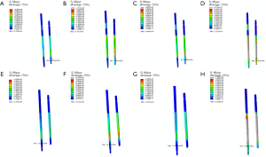 Unlike bone structures, the stress applied on pins demonstrated notable variation tendency in both numerical value and distribution region. According to the stress nephogram exhibited in Figure 4A,B,C,D, the peak value of stress applied on the left pins appeared on the proximal pin. During reclining, the 60° group showed the largest value (7.011 MPa) and area, and the 90° group was slightly larger than the 30° group (4.89 vs. 3.793 MPa). The value can reach as high as 25.12 MPa during standing. The same results can be found on the right side (Figure 4E,F,G,H), the numerical value in standing posture was the highest (28.29 MPa), followed with the 60° group (5.337 MPa). The 30° group and the 90° group were approximant (2.763 vs. 2.527 MPa). However, the peak value appeared on the distal pin.