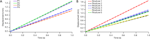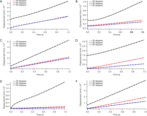 The variation tendency in displacement of four fragments and the relative movement between each fragment was the same. As we can find in Figure 5, the fragments obtained the largest displacement in the 60° group among the reclining postures (ranged from 0.02872 to 0.08673 mm), and the vertical posture gain the smallest displacement (ranged from 0.00521 to 0.03803 mm). The bilateral wing of ilium and the right superior pubic ramus showed a greater degree of displacement, indicating that the P1, P2, and P4 were more unstable. The relative movement was correlated with the movement of fragments (Figure 6), the larger displacement occurred between the three fragments mentioned above (Figure 6A,C,F), the fracture ends around P3 shown smaller relative movement (Figure 6B,D,E). However, when standing posture, the movement of the fragments and the relative displacement between them are significantly increased, and the amount of increase can reach two orders of magnitude (Figure 7). All the numerical values of displacement exceeded 1 mm under a compression of 50% body weight (ranged from 1.02675 to 1.50127 mm). The fracture end between P1 and P2 showed largest relative movement (1.68501 mm), which was similar to the reclining postures.