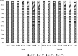 Table 2 shows the prevalence of hypertension, diabetes, and dyslipidemia stratified by sex and age. The overall prevalence rates were estimated to be 18.5% for hypertension, 6.0% for diabetes, and 8.3% for dyslipidemia. A similar pattern was observed in regard to the age trend. The prevalence of hypertension, diabetes, and dyslipidemia generally increased with age, reached a peak at the age of 65–74 years, and subsequently decreased. In particular, the prevalence of hypertension and diabetes more than doubled between 35 and 45 years while the prevalence of dyslipidemia increased fastest at the age of 25–34 years. After gender stratification, men had higher BP levels compared with women at all ages except for the first age group. However, the prevalence of diabetes and dyslipidemia was slightly higher in men than in women, mainly among middle-aged participants; it was significantly higher in women than in men for other age ranges (P<0.05). In the total population, more men suffered from hypertension compared with women, while no significant sex-related difference was found in the prevalence of diabetes and dyslipidemia. Figure 1 presents the prevalence rates for CVD risk factor clustering based on age and sex. The proportion of two or more risk factors (hypertension, diabetes, or dyslipidemia) increased with advanced age and reached the highest at the age of 65–74 years in both men (approximately 23%) and women (approximately 24%).