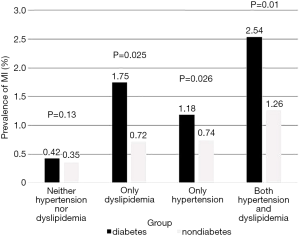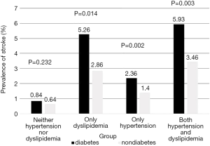 The overall prevalence of self-reported stroke and MI was 1.9% (210/11,036) and 1.0% (112/11,036), respectively. The participants were first classified into two categories according to the prevalence of diabetes and then divided into four groups. Group 1 comprised participants with neither hypertension nor dyslipidemia. Group 2 comprised participants with dyslipidemia but no hypertension. Group 3 comprised participants with hypertension but no dyslipidemia. Group 4 comprised participants with both hypertension and dyslipidemia. The prevalence of self-reported MI in Groups 1–4 in the diabetic population was 0.42%, 1.75%, 1.18%, and 2.54%, respectively. A significant decrease in prevalence was observed in the nondiabetic population except Group 1 (Figure 2). The prevalence of self-reported stroke in Groups 1–4 in the diabetic population was 0.84%, 5.26%, 2.36%, and 5.93%, respectively. Similar changes in the prevalence of MI were observed. Diabetes contributes to about twofold excess increase independently of other factors (Figure 3).
