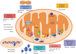 Some of the drugs intended to enhance mitochondrial function or to treat the consequences of mitochondrial dysfunction have been applied in the clinical treatment of mitochondrial diseases, but the application of these drugs is based on limited clinical trials and are only successful in certain mitochondrial diseases. Consequently, the treatment of mitochondrial diseases is largely symptomatic and this does not significantly change the course of such diseases. Given the lack of effective treatments for many mitochondrial diseases, several clinical studies have been designed to investigate different aspects of mitochondrial diseases. These studies have shown great promise and are expected to provide more effective treatment strategies for mitochondrial diseases. Some of the drugs that are currently being assessed include mitochondrial biogenesis enhancers (bezafibrate, epicatechin, and RTA 408), antioxidants (RP 103 and EPI-743), and cardiolipin protector (elamipretide). Gene therapy has shown positive results in the treatment of LHON, and the first successful gene therapy based on editing of the mtDNA in vivo has brought hope of curing mitochondrial diseases. Moreover other potential therapeutic methods are expected to provide more treatment options of mitochondrial diseases.