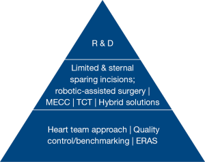 With the advent of transcatheter technology as the ultimate minimally-invasive strategy, there has certainly been a growing interest in MICS by both surgeons and patients alike. More surgeons than ever now offer some form of minimally-invasive surgery. At the same time, it is quite clear that the scrutiny of outcomes with surgical valve repair and replacement has entered a new era because of the availability and successes of transcatheter technology. For patients, the safety and quality of a surgical valve repair or replacement remain the most important outcomes and therefore must never be jeopardized for a less-invasive approach. Simultaneously, the concept of MICS has to extend beyond simply smaller incision (minimal-access surgery). A contemporary MICS program should encompass several other aspects including evaluation by a multidisciplinary heart team, an enhanced recovery after surgery program (ERAS), optimization of the cardiopulmonary bypass machine to reduce its impact, transcatheter technology and hybrid solutions (e.g., trans-atrial placement of a transcatheter heart valve in the mitral position) (Figure 1). In fact, these components play a major role in allowing patients to have a quicker recovery, and in combination with smaller, sternal-sparing incisions will make valve surgery a better alternative or complement to transcatheter technology (11). As is true with surgery using a traditional, not minimally-invasive approach, optimizing all phases (pre-, intra-, postoperative) and aspects of care (surgical and non-surgical) will ultimately result in best outcomes and most expedient recovery from what remains a major impact on the body in spite of being labeled minimally-invasive.