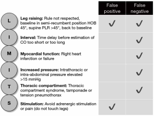 Fluid therapy is often used as first line therapy in critically ill patients in shock. Among the methods currently available to detect preload responsiveness, the PLR test has been demonstrated to be reliable in many studies and a recent meta-analysis (1,2). According to Monnet and Teboul, five rules need to be taken into account, when performing a PLR (3). First, PLR should start from the semi-recumbent and not the supine position. Second, the PLR effects must be assessed by a direct measurement of cardiac output and not by the simple measurement of blood pressure. Third, the technique used to measure cardiac output during PLR must be able to detect short-term and transient changes since the PLR effects may vanish after 1 min. Fourth, cardiac output must be measured not only before and during PLR but also after PLR when the patient has been moved back to the semi-recumbent position, in order to check that it returns to baseline. Fifth, pain, cough, discomfort, and awakening could provoke adrenergic stimulation, resulting in erroneous interpretation of cardiac output changes. We would like to add a sixth rule: confounding factors and underlying conditions that may influence the PLR must be assessed before performing the test, these include increased intrathoracic pressure [high PEEP, presence of autoPEEP, thoracic compartment syndrome (e.g., tension pneumothorax)], cardiac tamponade, right ventricular infarction or failure and intra-abdominal hypertension (IAH), the latter defined as an intra-abdominal pressure (IAP) above 12 mmHg.