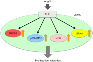In the present issue of Ann Transl Med, Wang et al. report that cortistatin (CST) inhibited Ang II-induced VSMC proliferation and migration by suppressing extracellular signal-regulated kinase (ERK) 1/2, p38 mitogen-activated protein kinase (MAPK), c-Jun N-terminal kinase (JNK) and ERK5 signaling pathways (3) (Figure 1). Earlier studies have revealed that the Ang II-induced cellular responses are attributable, in part, to the phosphorylation of intracellular signaling molecules including the mitogen-activated protein (MAP) kinase family, i.e., ERK1/2, JNK (4). It has been reported that Ang II phosphorylates ERK1/2, JNK in VSMC (5,6). We also reported that Ang II stimulated ERK1/2, JNK and p38 MAPK activation in VSMC and Ang II caused cellular hypertrophy (7), migration (8) and proliferation (9). From these findings, it is currently obvious that Ang II stimulates VSMC proliferation and migration through the activation of MAP kinase pathways.