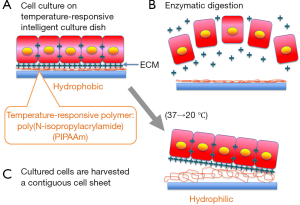 Regeneration of tissues and organs offers an innovative approach to the treatment of injury and disease with substituted artificial organs and organ transplantations. The term ‘‘tissue engineering’’ was first utilized in the late 1980s, the use of cultured cells as a therapeutic modality was initiated by Howard Green and associates, who transplanted cultured sheets of autologous epidermis to patients resulting from severe burns, giant congenital nevi, and skin ulcers. The key technology is the use of biodegradable polymer scaffolds, preformed in the target tissue shape, for seeding cells, as demonstrated in the well-publicized reconstruction of cartilage tissues for the growth of human ears on mouse back. Since the mid-1990s, significant progress from basic science has resulted in clinical applications of tissue engineering for the replacement of a variety of tissues and organs. An innovative approach to tissue engineering using a thermo-responsive culture surface has been developed from 1990s (1). Poly (N-isopropylacrylamide) (PIPAAm) exhibits a lower critical solution temperature (LCST) in aqueous media at the vicinity of 32 °C. While they hydrate and form an expanded structure in an aqueous media below the LCST, they dehydrate and form a compact structure above the LCST. Such a conformational change in response to temperature has been extensively used to modulate the physicochemical properties of polymeric thin surfaces. At 37 °C, PIPAAm-grafted surface is slightly hydrophobic, allowing cells to proliferate under normal conditions and become a confluent cell sheet, which is regularly found on usual tissue culture polystyrene. A decrease in temperature lower than 32 °C, however, results in the hydration of the polymer surface, giving the spontaneous detachment of the cells as a monolithic tissue-like cell sheet for less than 1 h without any enzymes such as trypsin. Since PIPAAm is covalently immobilized onto the culture surfaces, PIPAAm remains bound to the surfaces even after cell sheet detachment, realizing the non-invasive harvest of cultured cells as an intact cell sheet having deposited ECM. This technology allows us to transplant cell sheets to host tissues without using biodegradable scaffolds. PIPAAm thickness on the order of nanometers is necessary for expressing such interesting properties as temperature-controlled cell attachment or detachment. For example, a PIPAAm layer of approximately 20 nm is optimal for cell adhesion and detachment properties in response to temperature change for a PIPAAm-modified tissue culture polystyrene system. Since the PIPAAm-grafted surfaces facilitate spontaneous cell detachment, the use of conventional proteolytic enzymes such as dispase, trypsin, and collagenase, can be avoided. With noninvasive cell harvest, cell-to-cell junction and ECM proteins can therefore be maintained (2) (Figure 1).