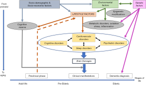 By contrast to cardiometabolic disorders (where the causal effect of all four health behaviors have been established), no consistent conclusions can be drawn and the role of lifestyle factors in dementia onset. This is mainly due to the conflicting results from prospective cohort studies and the inaccuracies on the period of life during which favorable lifestyles might afford protection against dementia. The understanding of health behavior-dementia association in observational studies has to take into account the preclinical period preceding the diagnosis, the phenotypic heterogeneity of dementia and the complex interplay of genetic, socio-economic status, lifestyle and health status (cardiometabolic, depressive, sleep disorders), as illustrated in Figure 1.
