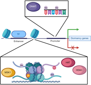 The tumor-initiating capability of dormant DCCs is intimately linked to their acquisition of cancer stem cell (CSC) traits (39). Dormant DCCs display transcriptional and phenotypic features of CSCs across multiple cancer types (40). Conversely, CSCs are sustained within metastatic niches via signaling pathways that also activate dormancy programs, including Wnt, Notch (39), bone morphogenetic proteins [BMPs; (14,41)], Hedgehog (42), and transforming growth factor-β [TGF-β; (43)]. Several of these pathways converge on common intracellular effector molecules, such as the mammalian target of rapamycin [mTOR; (44)] and the mitogen-activated protein kinases (MAPKs) ERK and p38 (12,45). Ligands that modulate flux through these pathways may be the product of cell-cell communication between DCCs (46); they are also derived from stromal cells (14,41,47), immune cells (19,48), or the extracellular matrix (38,49). Given the distributive nature of these inputs and the need to respond to intrinsic and environmental cues in real time, dormant DCCs must mobilize epigenetic effectors in order to persist indefinitely, retain their self-renewal capacity, and preserve their ability to assume new phenotypes, as we presently outline.