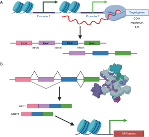 In dormancy, epigenetic regulation via chromatin remodeling not only influences gene expression globally, but also impacts the expression of alternative RNA isoforms in particular (Figure 2A). For example, chromatin structure dictates isoform expression of the CSC surface marker CD44 (58). In addition, upregulation of specific isoforms of the histone macroH2A (macroH2A1.1 and macroH2A2) is indicative of a dormant state and can act as a biomarker for lung cancer recurrence (59). Similarly, the inhibitor of differentiation 1 (ID1) isoform ID1b promotes dormancy by inducing cell cycle arrest at G1/G0 both in vitro and in vivo (60). ID1b represses ERK activation and simultaneously increases the expression of the tumor suppressor p27 and CSC markers NOTCH1 and ALDH1A1. In contrast, the ID1a isoform promotes proliferation, thereby antagonizing the function of ID1b. Interestingly, while the majority of transcript variants associated with dormancy appear to be the result of chromatin remodeling, some posttranscriptional splicing events generate RNAs that directly regulate chromatin architecture (Figure 2B). For instance, the X-box binding protein 1 (XBP1) isoform sXBP-1 activates the unfolded protein response (UPR) in response to cellular stressors typically faced by dormant DCCs, such as hypoxia. sXBP1 is upregulated in CSCs and dormant DCCs, likely because the UPR transcriptional program allows these cells to withstand the stresses imposed by new micrometastatic niches (61,62). RNA processing therefore plays a central role in acclimation and survival of dormant DCCs. Moreover, RNA isoform expression can be interrogated in order to illuminate the mechanisms underlying metastatic recurrence.