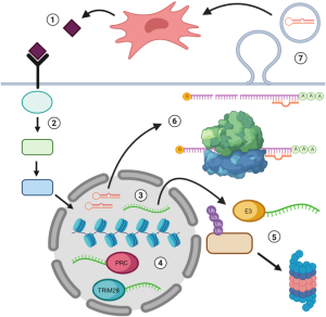 Long non-coding RNAs (lncRNAs) are defined as ncRNAs that are longer than 200 base-pairs and lack an open reading frame; they also have diverse functions in enhancing or suppressing gene expression. In metastatic disease, lncRNAs often carry clinical and functional significance in driving disease progression and recurrence (Figure 3). For example, the lncRNA HOTAIR is a strong predictor for breast cancer metastasis and is correlated with recurrence in cancers of the liver, stomach, bladder, and cervix (75-78). At a molecular level, HOTAIR recruits the polycomb repressive complex (PRC) to specific regions of chromatin, thereby coordinating the epigenetic silencing of target genes such as p21 and Wnt inhibitory factor 1 [WIF1; (79,80)]. Along these lines, expression of the lncRNA metastasis associated lung adenocarcinoma transcript 1 (MALAT1) is associated with tumor recurrence and poor prognosis in breast and prostate cancers (81). Like HOTAIR, MALAT1 can assemble the PRC to facilitate histone methylation and control the expression of pro-tumorigenic factors (81,82). The lncRNA BORG (BMP/OP-responsive gene) similarly stimulates metastatic outgrowth in dormant breast DCCs by directing transcriptional repression by the E3 SUMO ligase TRIM28 (83,84). In short, lncRNAs function as primary mediators of the chromatin and transcriptomic alterations that effect metastatic dormancy and reactivation.