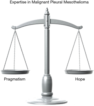 In the modern real-life it is usual to find patients with MPM who are conducting a battle between the desire to live (hope) and the cruelty given by the large amount of data available on internet saying that the survival is poor (pragmatism) (11). For surgeons and oncologists, although at a different level of sadness, things are similar as we experience the contrast between the scientific evidence that surgery or other treatment does not “cure” MPM but in the same time we feel uncomfortable to deny hope to our patients.