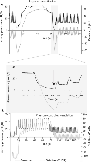 We want to call attention to yet another aspect of the ventilation protocol: recruitment maneuvers. Both groups, PEEPEIT and PEEP5, were submitted to a bag-squeezing recruitment maneuver of 35 cmH2O for 15 seconds at the restart of double lung ventilation. For healthy nonobese patients, inspiratory pressure less than 40 cmH2O might not be enough to open all the atelectatic areas in all patients (24). Besides, the bag-squeezing recruitment maneuver often leads to depressurization when switching from manual to controlled ventilation (Figure 1A), resulting in partial lung collapse (25). Conversely, recruitment maneuvers using controlled ventilatory modes are safer against derecruitment (Figure 1B).