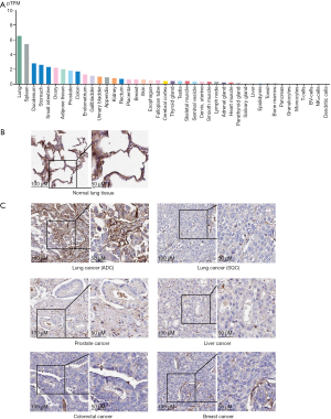 Lung cancer is known for its high incidence worldwide. Meanwhile, it is the leading cause of cancer-related death (1). In 2018, estimated numbers of death for lung cancer is 690,567 in China and 152,423 in United States (2). Lung cancer is mainly divided into two subtypes: non-small cell lung cancer (NSCLC) and small cell lung cancer (SCLC). And NSCLC includes lung adenocarcinoma (ADC), squamous cell carcinoma (SQC) and large cell lung cancer, etc. Over the past few decades, multiple therapies have been developed to treat patients with NSCLC. The traditional therapies such as surgery, chemotherapy and radiotherapy have extended patients’ survival to some extent. However, the benefits have always been limited and transient (3). For patients with recurrent or unresectable lung cancer, there remains an urgent need to develop more novel treatments. The small molecule tyrosine kinase inhibitors (TKIs) and immunotherapy have brought new hope to patients with NSCLC (4). But the TKIs are only beneficial for a subset of patients whose tumors harbor specific gene alterations, such as EGFR mutations, EML4-ALK rearrangements. And due to the acquisition of secondary mutations or activation of bypath signaling pathways, acquired resistance of TKIs become another inevitable challenge (5). The immune checkpoint blockade therapy is just suitable for some selected patients. When immune checkpoint inhibitor acts as monotherapy for lung cancer patients, its efficacy is low. In general, lung cancer patients with higher expression of immune checkpoint molecules (PD-L1, PD-1 or CTLA-4) in tumor tissues exhibited more obvious response to checkpoints inhibitors (6). Thus, early diagnosis and novel treatment options are critical for improving the outcome of patients with lung cancer. Specifically, it is essential to identify biomarkers that can be used to predict prognosis and to track recurrence.