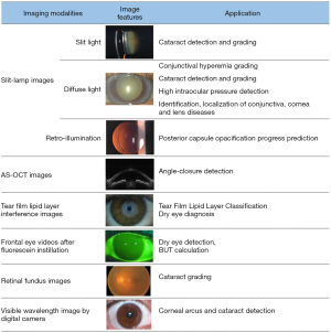Multiple ophthalmic imaging modalities, such as slit-lamp images (10-17), AS-OCT images (18-23) and tear film lipid layer interference images (24-27), have been widely used in AI for the diagnosis of anterior segment ocular diseases. In addition, structured data, such as corneal parameters (28-33), have been used as well. The ophthalmic imaging modalities used in diagnosis are illustrated in Figure 1.