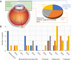 A total of forty-five representative articles of AI application in anterior segment ophthalmic diseases are included in this review. Among them, the most intensively researched are conjunctiva and tear film, cornea, glaucoma and cataract. The distribution of the papers concerning these four topics in year of publication is shown in Figure 3. Details about aforementioned articles are summarized in http://fp.amegroups.cn/cms/8e23864133337a312edb32e11e7655dd/atm-20-976-1.pdf (39-53).