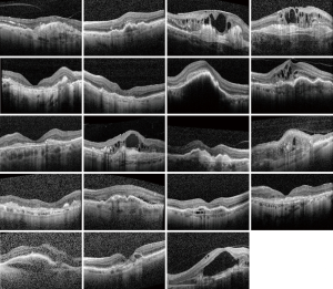 Baseline variables regarding patient age and gender, cessation of active treatment, refraction, CDVA, CRT, operation time, phacoemulsification energy are presented in Table 1. Preoperative cataract classification and macular status are presented in Table 2. Preoperative optical coherence tomography images are shown in Figure 1.