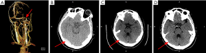 For early complications post-stenting, 4 patients (11.4%) in control group complicated with stenting-related subdural hematoma, all the hematomas located at the contralateral of the stenting side (Figures 1,2). Whereas, no subdural hematoma event (0.0%) occurred in perioperative management group, P=0.031. Other complications, such as stent-adjacent stenosis, intraluminal thrombosis, and intraluminal restenosis showed no statistic difference between the two groups.