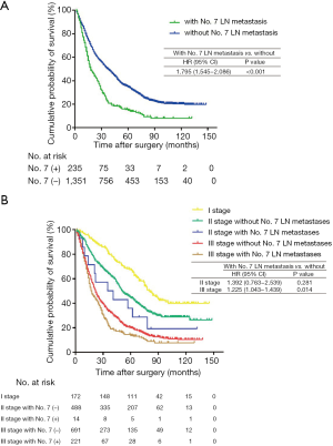 The prognostic impact of the No. 7 station LN metastases in patients was determined. During the follow-up, 1,229 patients died and 357 patients remained alive. Kaplan-Meier analyses showed a significant difference in terms of prognosis between the No. 7 LN-negative (no metastasis) and the No. 7 LN-positive (metastases) patients (HR 1.795, 95% CI: 1.545–2.086, P<0.001, Figure 1A). The median survival time of No. 7 LN-negative and No. 7 LN-positive patients was 38±1.757 vs. 18±1.730 months. That survival difference was also significant after stratification by pTNM stage (III stage with vs. without the No. 7 LN metastases: HR 1.225, 95% CI: 1.043–1.439, P=0.014, Figure 1B). Although the small-scale samples resulted in the non-significant difference in patients with II stage (II stage with vs. without the No. 7 metastases, HR 1.392, 95% CI: 0.763–2.539, P=0.281), the potential tendency of survival difference might be observed in the Figure 1B.