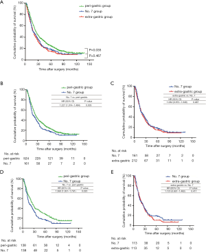 The prognostic analysis among peri-gastric, the No. 7 and extra-gastric groups was performed (Figure 2A). During the follow-up, the survival rates of these three groups were respectively: 15.4% (81/524), 13.04% (21/161) and 10.38% (22/212). And the median survival time were respectively: 24±1.381, 18±2.819, and 18±1.266 months. Before matching, Kaplan-Meier curve showed a significant difference in terms of prognosis between the No. 7 group and peri-gastric group (HR 1.227, 95% CI: 1.014–1.484, P=0.035, Figure 2B), but no significant difference in survival outcomes between the No. 7 group and extra-gastric group (HR 1.084, 95% CI: 0.872–1.349, P=0.467, Figure 2C). After PSM, the OS was also significantly poorer in the No. 7 group compared with peri-gastric group (HR 1.360, 95% CI: 1.051–1.761, P=0.020, Figure 2D). Similarly, the close survival rate between No. 7 group and extra-gastric group (HR 1.123, 95% CI: 0.851–1.482, P=0.411, Figure 2E) was observed after PSM.