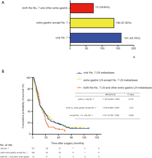 Patients in the extra-gastric group were further subdivided into two subgroups: 138 (37.00%) patients with extra-gastric LN except No. 7 LN metastases (No. 8a, No. 9, No. 10, No. 11, or No. 12a), and 74 (19.84%) presented with both the No. 7 LN and other extra-gastric LN metastases (Figure 3A).Patients without the No. 7 LN metastases failed to be elucidated to be significantly associated with the higher survival rate compared to other subgroups of patients (Figure 3B), which indicated the No. 7 LN should not be considered as the predictive LN for the extra-gastric LN metastases.