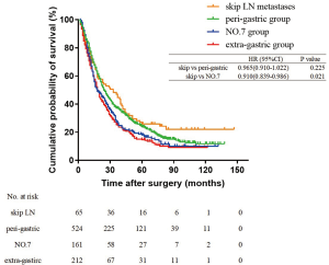 Survival analysis for patients with extra-gastric LN metastases except the No. 7 LN