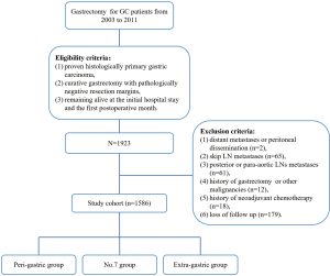 Between January 2003 and December 2011, a total of 1,923 GC patients who underwent R0 gastrectomy at Tianjin Medical University Cancer Institute and Hospital. The clinicopathologic date and fellow-up records of 1,923 GC patients were retrospectively reviewed after receiving Institutional Review Board approval. Eligibility criteria included: (I) proven histologically primary gastric carcinoma; (II) curative gastrectomy with pathologically negative resection margins (R0 resection); (III) remaining alive at the initial hospital stay and the first postoperative month. The exclusion criteria were: (I) distant metastases or peritoneal dissemination; (II) skip LN metastases; (III) posterior (No. 8p, No. 12b/p, No. 13, and No. 14v) or para-aortic (No. 16a2, and No. 16b1) LNs metastases; (IV) history of gastrectomy or other malignancies; (V) history of neoadjuvant chemotherapy; and (VI) loss of follow up.