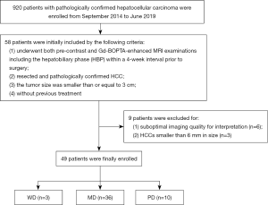 Medical records from September 2014 to June 2019 were reviewed to identify patients with surgically resected HCC who underwent a preoperative liver MRI examination with Gd-BOPTA in our hospital. Initially, 58 patients meeting the following eligibility criteria were included: (I) history of undergoing both pre-contrast and Gd-BOPTA-enhanced MRI examinations including the hepatobiliary phase (HBP) within a 4-week interval prior to surgery, (II) resected and pathologically confirmed HCC, (III) a tumor size smaller than or equal to 3 cm, and (IV) no evidence of any previous HCC treatment. Subsequently, 9 patients were excluded due to the following exclusion criteria: (I) suboptimal imaging quality for interpretation (n=6) and (II) HCCs smaller than 6 mm in size excluded to avoid measurement bias due to partial volume effects (n=3). Finally, 49 patients were recruited into this retrospective cohort. Our flowchart of inclusion and exclusion criteria for study patients is shown in Figure 1.