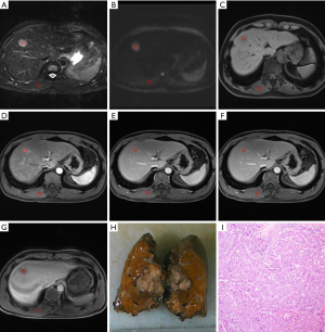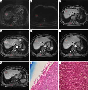 A total of 49 cases were examined with 3.0T MRI system (Magnetom Verio; Siemens Healthcare, Erlangen, Germany) with an 8-channel body phased-array coil. Pre-contrast images were obtained using respiration-triggered T2W fat-suppression turbo spin-echo sequence [repetition time (TR), 6,500–7,000 ms; echo time (TE), 79 ms; slice thickness, 5 mm; matrix, 320×224; bandwidth, 240 Hz/pixel; gap, 1 mm], a breath-hold T1-weighted gradient-echo in-phase sequence (TR, 133 ms; TE, 2.5 ms; matrix, 320×224; bandwidth, 280 Hz/pixel), an out-of phase sequence (TR, 133 ms; TE, 1.2 ms; matrix, 320×224; bandwidth, 280 Hz/pixel), a diffusion-weighted imaging (DWI) (TR, 6,300 ms; TE, 93 ms; gradient factor b values of 50 and 800 s/mm2; matrix, 128×128; slice thickness, 3 mm), and a T1-weighted three-dimensional (3D) volumetric interpolated breath-hold examination gradient-echo sequence with fat suppression (TR, 3.9 ms; TE, 1.4 ms; matrix, 320×224; bandwidth, 400 Hz/pixel; slice thickness, 3 mm; gap, 0 mm). For dynamic MRI, Gd-BOPTA (Bracco, Italy; 0.1 mmol/kg) was injected as a rapid bolus and immediately followed by a 20 mL saline flush through a power injector at a rate of 2 mL/s. Dynamic imaging, including the arterial phase (AP) (20–25 s), portal venous phase (60–70 s), equilibrium phase (2 min), and the delayed HBP (60–120 m), was performed using a T1-weighted 3D volumetric interpolated breath-hold examination with the equivalent parameters.