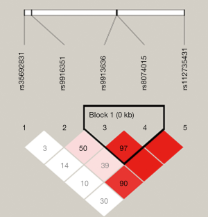 The pairwise linkage disequilibrium D’ values among the five SNPs were calculated for different sample sets. The SNPs with D’ >0.75 in separated sample sets were grouped in the same block, and rs9913636-rs8074015 was identified as one haplotype block (Figure 1). In this block, one haplotype “GACG” showed significant association with MMD (Table 4).