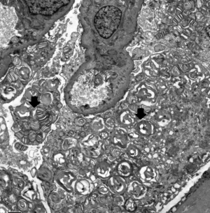 Electron microscopy revealed obvious vacuolar degeneration of capillary endothelial cells, typical electron-dense multilamellar inclusions and zebra bodies and an increase in secondary lysosomes in the cytoplasm of epithelial cells (Figure 4).