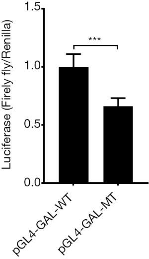 SNP in the GAL promoter, g.1170C>T, together with the side sequence formed to a potential transcriptional start site (TSS)—GTCACC. Therefore, we cloned the promoter of GAL including the TSS into the dual luciferase reporter system whose original Kozak site was deleted by Nco I restriction endonuclease. Vectors were transfected into the 293T cell. The assay results showed firefly/Rellina luciferase signal ratio in pGL4-GAL-MT group is weaker than WT group (0.58±0.10 vs. 1.00±0.18, P<0.005, Figure 6), it indicated the mutation of GAL DNA sequence would decrease the transcription of firefly gene after it.