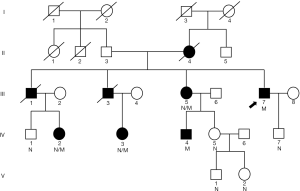 Seven people (II4, III1, III3, III5, III7, IV3 and IV4) from three generations exhibited different clinical symptoms; the main manifestations were neuropathic pain, angiokeratoma, and renal impairment. Three of the seven people were dead. Two were the proband’s brothers, and one was his mother. His two brothers (III1, III3) died of renal failure at 42 and 34 years of age, accompanied by neuropathic pain and angiokeratoma. His mother (II4), who died of natural causes, only manifested neuropathic pain and angiokeratoma. A retrospective study found that their clinical manifestations were consistent with the classical symptoms of FD. Of the 5 surviving symptomatic subjects (III5, III7, IV2, IV3, and IV4), 2 men (III7 and IV4) had kidney damage, and 2 women (III5, IV2, and IV3) showed only neuropathic pain, hypohidrosis or angiokeratoma. The 10 individuals included all 5 living symptomatic persons in the family. Medical history, laboratory tests, and WES was performed for 10 of the family members (The results of clinical data are summarized in Table 1). Proband (III7) is the oldest, at 47 years old. The diagnosis of FD was made based on typical histological features from renal biopsy. Skin biopsy also suggests typical angiokeratoma. The youngest is only 2 years old (V1).