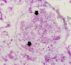 This report shows an important point regarding kidney biopsy. The kidney is one of the main target organs of FD, and renal pathological examination has been widely carried out. Although the proband’s kidney specimen demonstrated a mildly abnormal appearance under light microscopy examination, electron microscopy clearly demonstrated lamellated myelin structures and confirmed the diagnosis of typical FD (26). If the characteristic changes of renal pathology can be fully understood, when they are combined with clinical multisystem performance, the diagnosis rate of FD can be greatly improved. Some clinically normal heterozygous females have typical kidney biopsy findings (27). GLA activity when measured in blood may not reflect the true level of the enzyme activity in the affected organs. Therefore the critical threshold of GLA activity is hard to be determined (28). This implies that biopsy of the involved organ could help us identify the extent of FD and start therapy accordingly.
