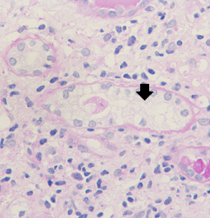 Renal biopsy results from the proband (III7) revealed vague vacuolization of podocytes on microscopic examination after staining by periodic acid-Schiff (PAS) (Figure 2). Section lining epithelial cell proliferation and wall segment thickening were also observed. The renal tubular epithelial cells showed granular, vacuolar, and foamy changes (Figure 3). There was an infiltration of renal interstitial inflammatory cells, severely fibrosis, and internal renal artery wall thickening.